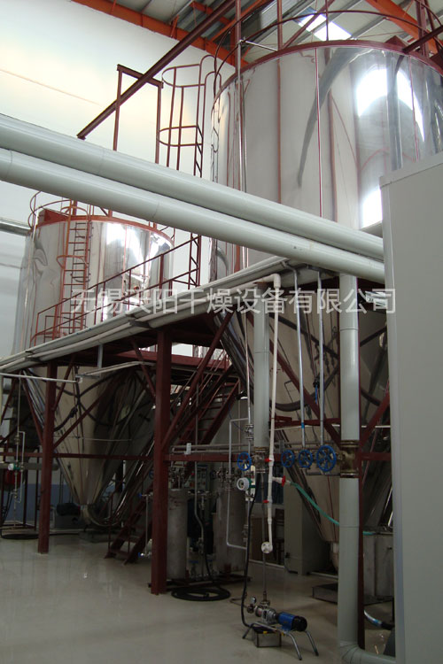 該設備由供料系統、空氣加熱凈化系統、干燥塔系統、收料系統、控制系統等多個系統整合而成。主塔系統集中了目前噴霧干燥工程的所有技術,噴干機組的收料系統由一級旋風分離器+布袋除塵器組合形成。一級旋風采用高氣量高效率旋風進行收集,其收粉率能達到98%左右分,而布袋除塵器是針對蛋白粉類除塵專門設計的優化設備,能使物料與風進行完全分離并沉降,布袋為拒水防油防靜電布袋,過濾目數可達500目以上。